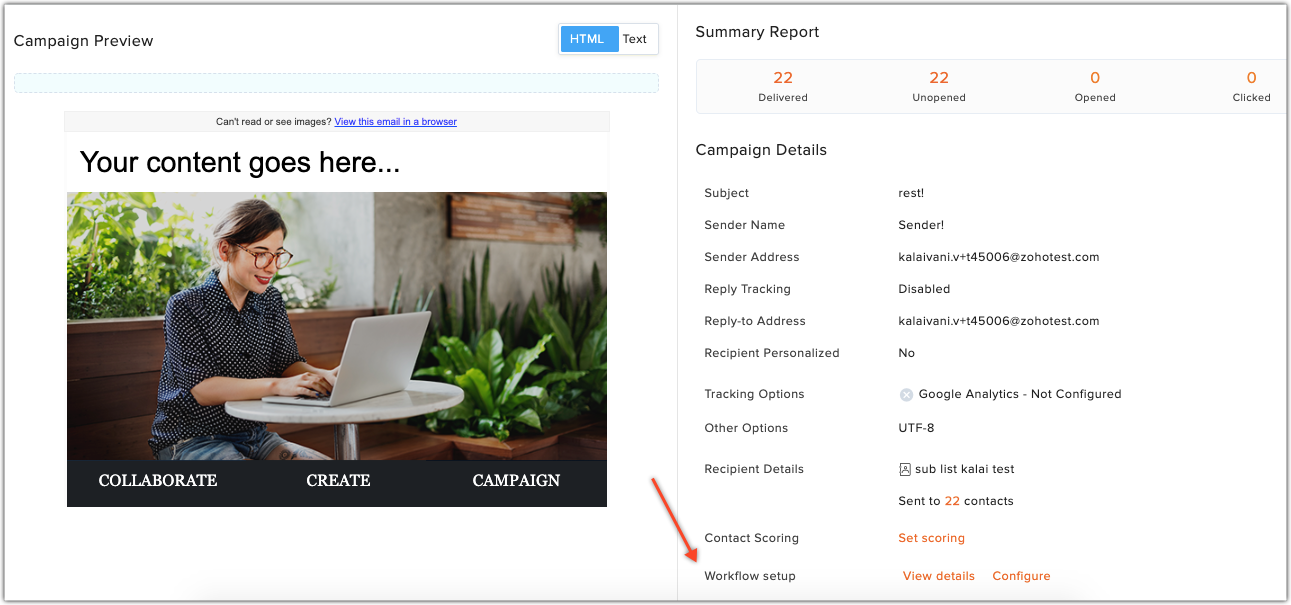 Select the intended campaign. From the campaign summary, select from among the active workflows listed for each email action under Workflow Setup.
