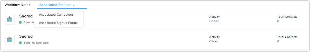 Activity-based workflows can be activated and invoked from other entities that includes email campaigns and signup forms. Active workflows can only be associated with entities. You can associate a single workflow with any number of entities.