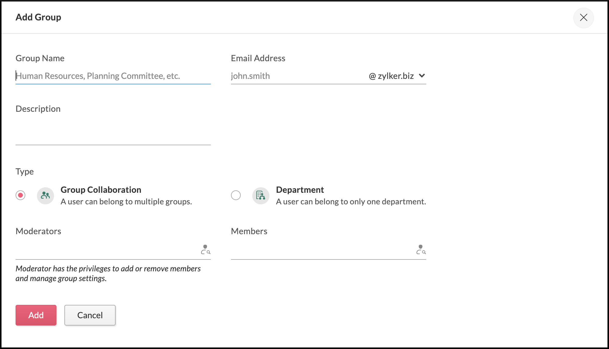 Sign in to the Zoho One Admin Panel. Go to Groups and click the group to which you need to add employees. Click Add Members, then select the employees to be added. Assign their role in the group. Moderators: Moderators can add or remove members and ...