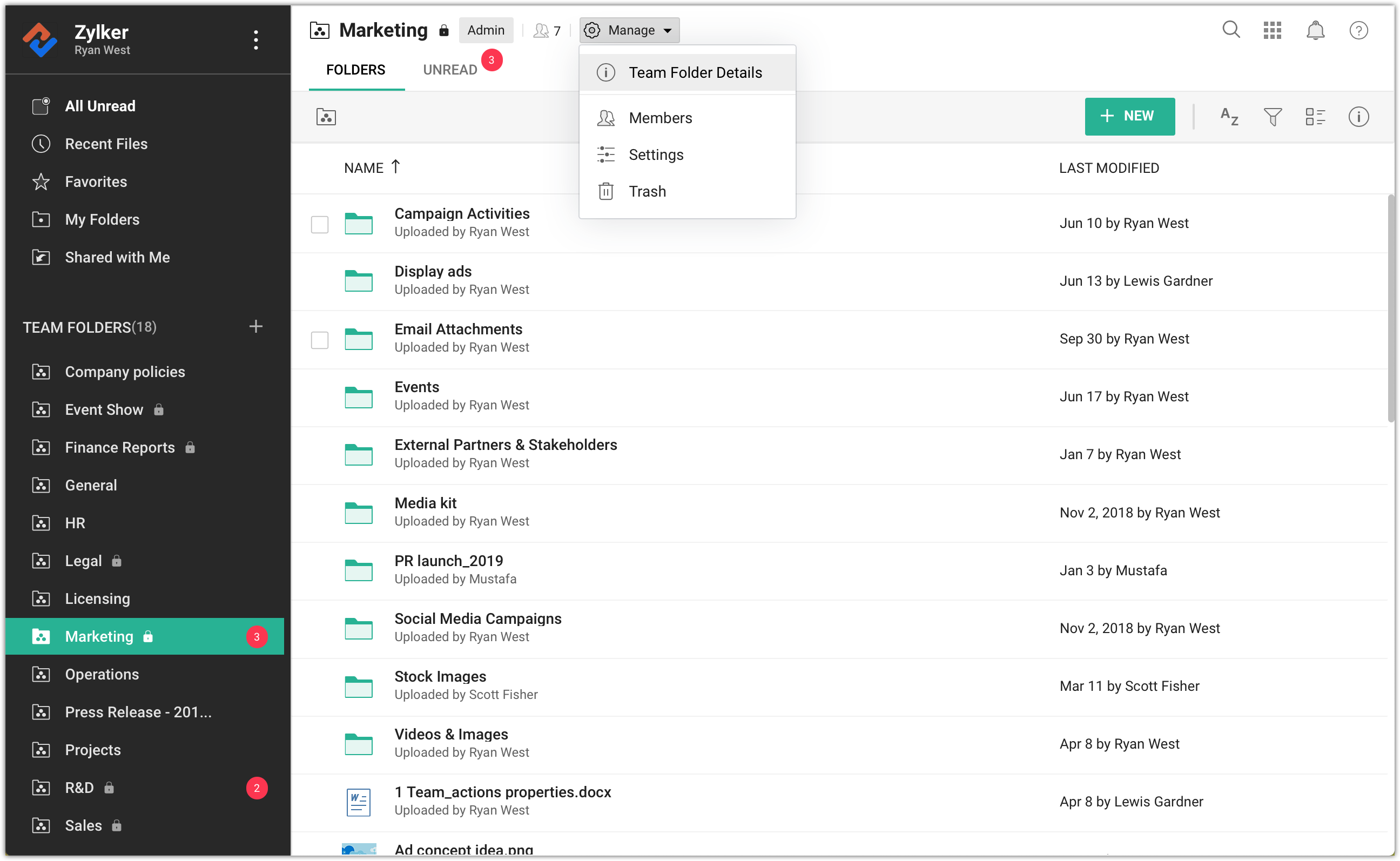 2. Click Manage in the top and select Team Folder Details from the dropdown.