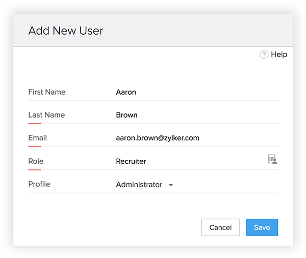 When you add a user, you will be specifying only the Name, Email address, Role and Profile details. You can add the other details of the user, such as phone numbers, address, photo, fax, website, date of birth, language, etc. later whenever needed.