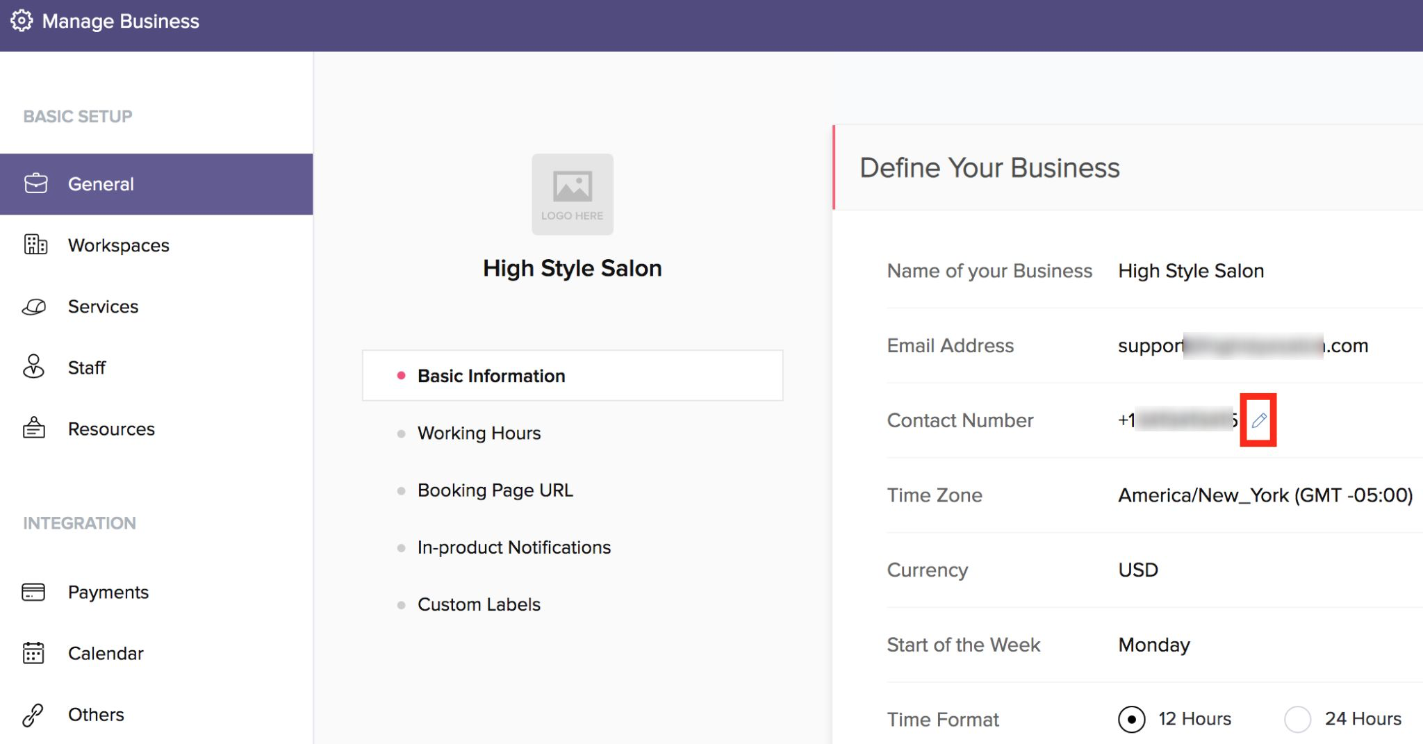 Contact Number - This refers to the official contact number for your business. The contact number is displayed in the
