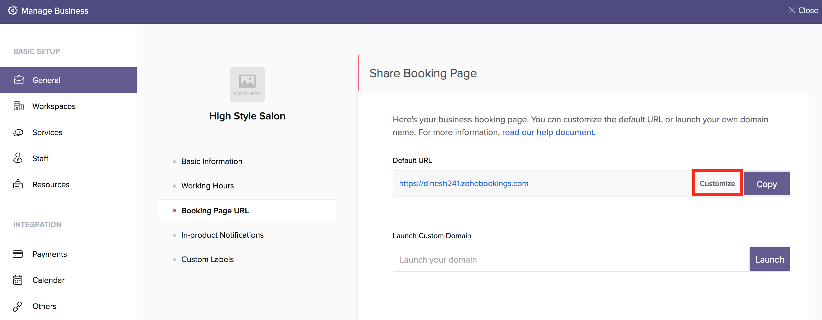 If you already have a domain for your business, and would like to map it with the Booking URLs, you can do it in the "Launch Custom Domain" section as described below.