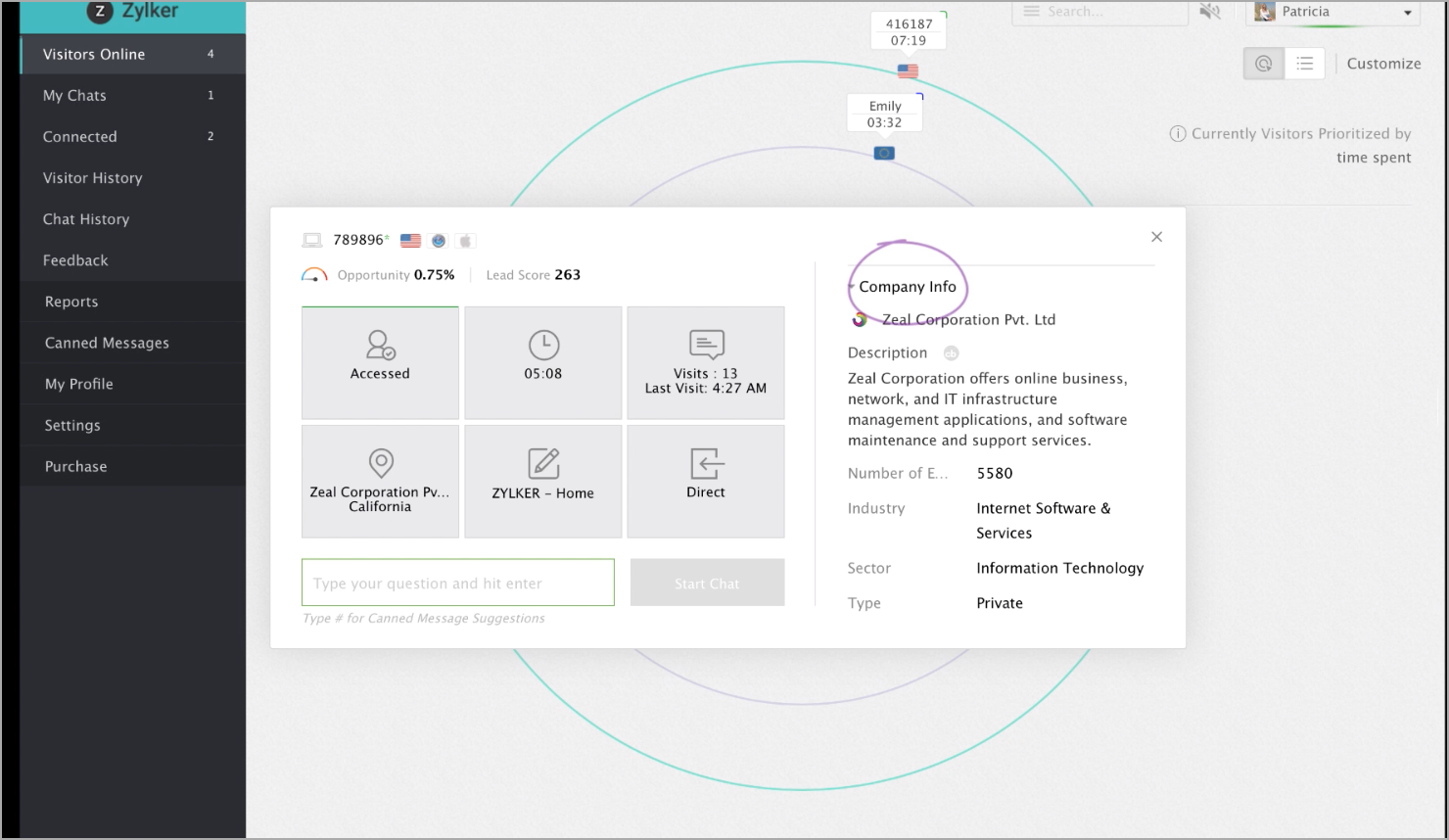 You can view the Clearbit details about the visitor such as Company info pushed to Zoho SalesIQ on the right side of the chat window. The info displayed about the visitor may vary based on the input received from Clearbit.