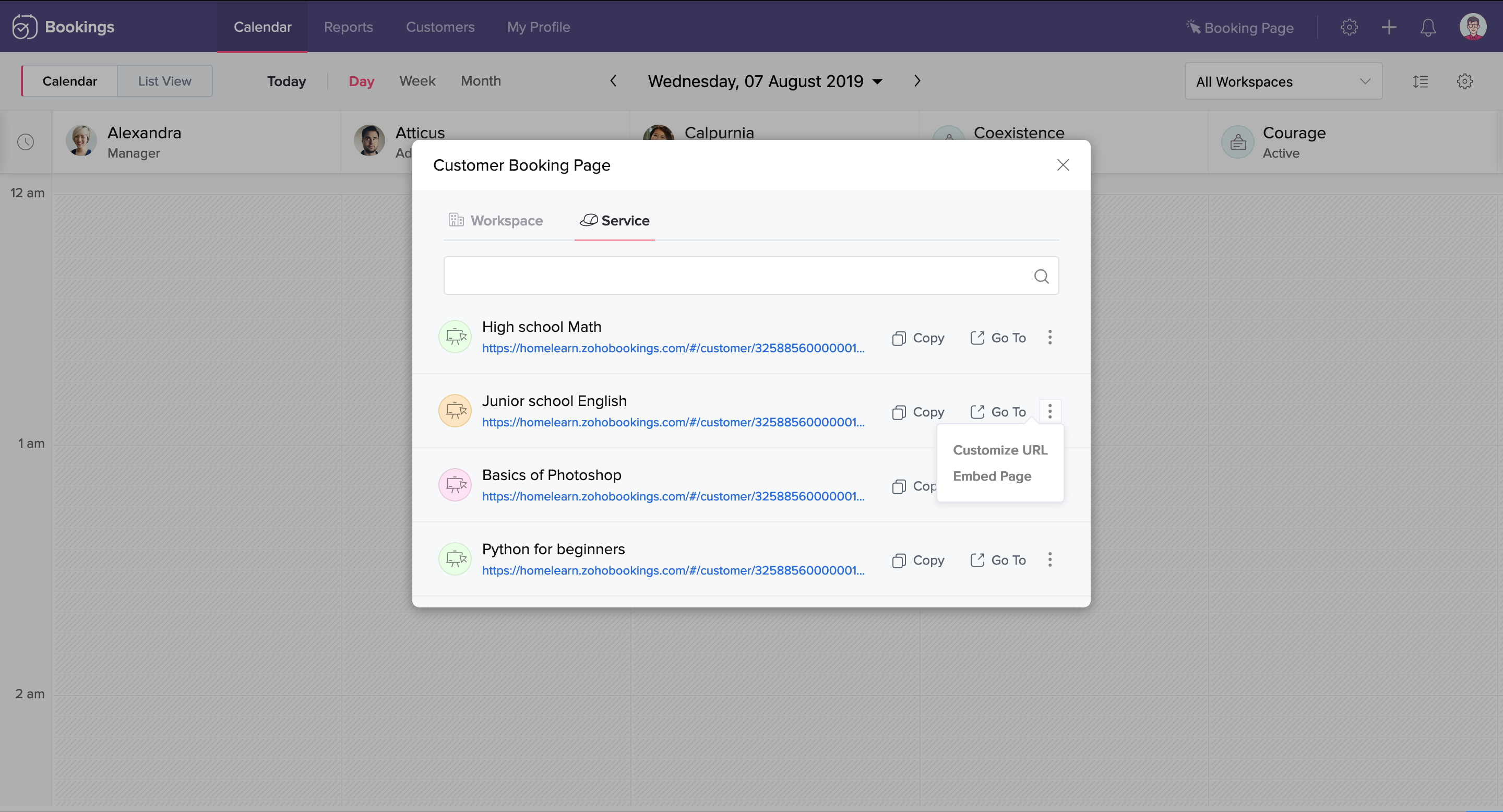 - Use the More icon to customize your booking page URL or to get an embed code for the page.