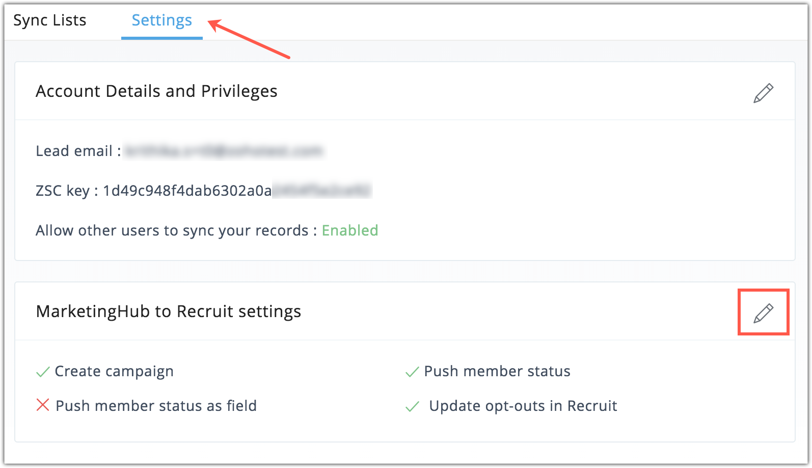5. Click the Edit icon beside MarketingHub to Recruit settings.