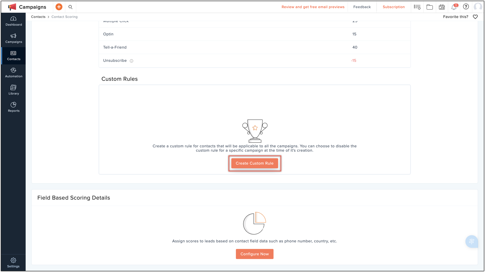 You can subtract the scores for your contacts when they perform any action in your emails that you consider as negative. Using this, whenever a contact makes any specific negative response that you've set, the assigned score will be subtracted from the overall score. To setup negative scoring: