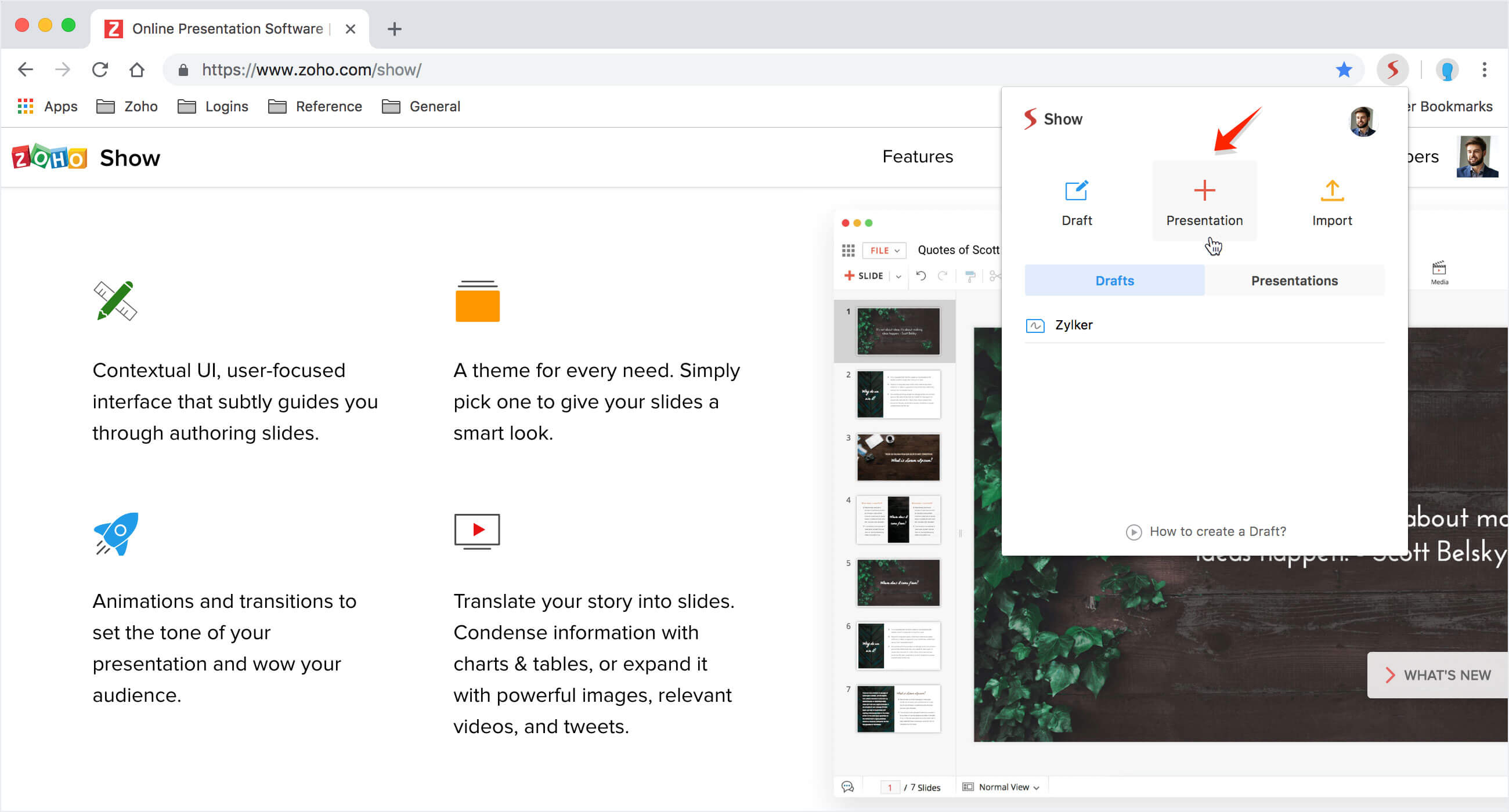 The Show extension for Chrome makes it easy to create and publish presentations. You can easily customize slides with themes, background fills, animations, transitions, and more. Additionally, you can, add comments, review slides, and collaborate with your team or specific individuals in real time.
