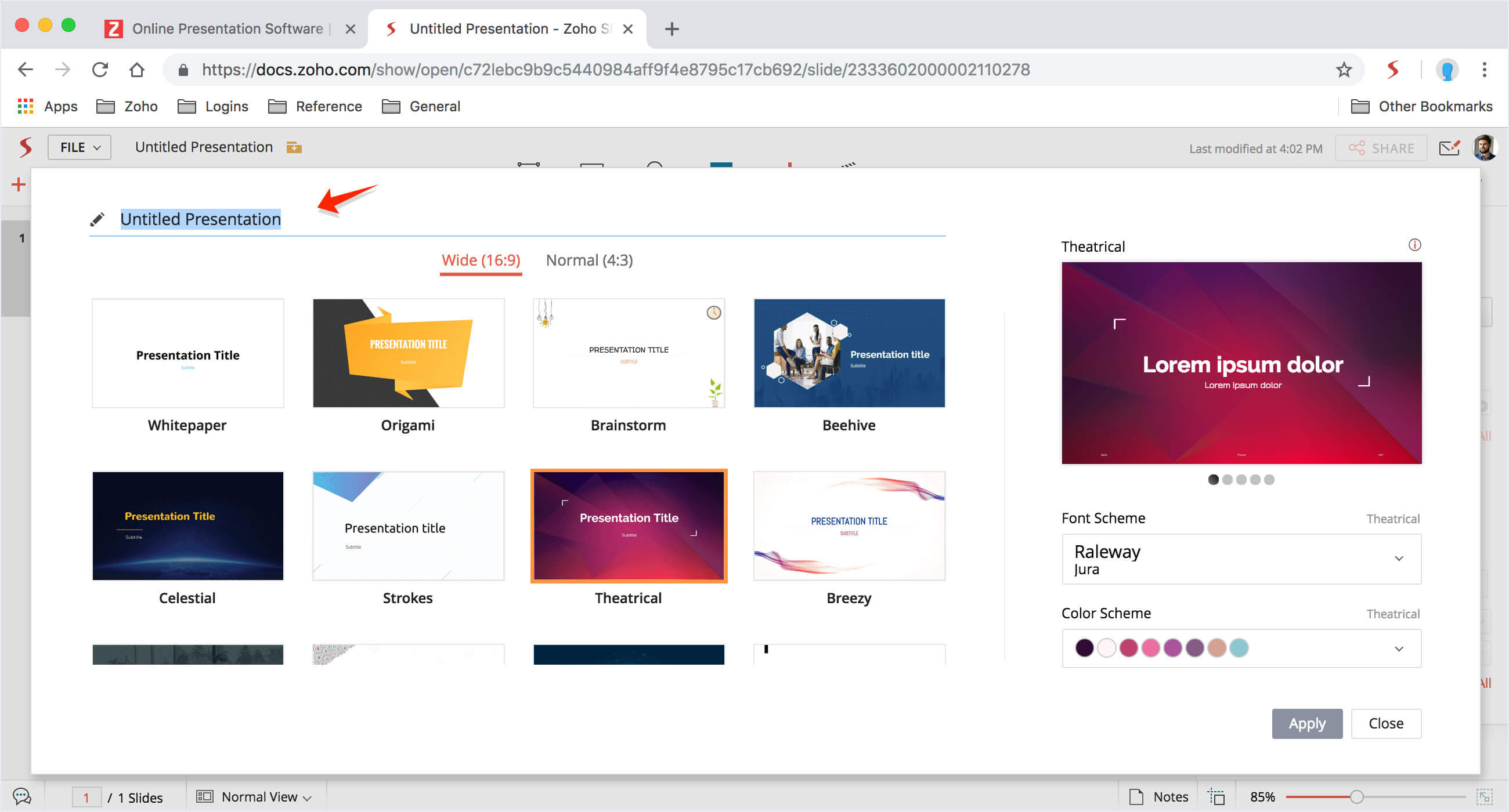 3. Choose an appropriate theme from the gallery and enter a name for your presentation in the Untitled Presentation text box.