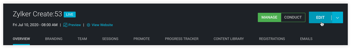 Be it changing the venue of your event or the agenda or adding a new page to your event's microsite, you can make changes to all event details by editing the event. The details will be automatically updated in the event's microsite.