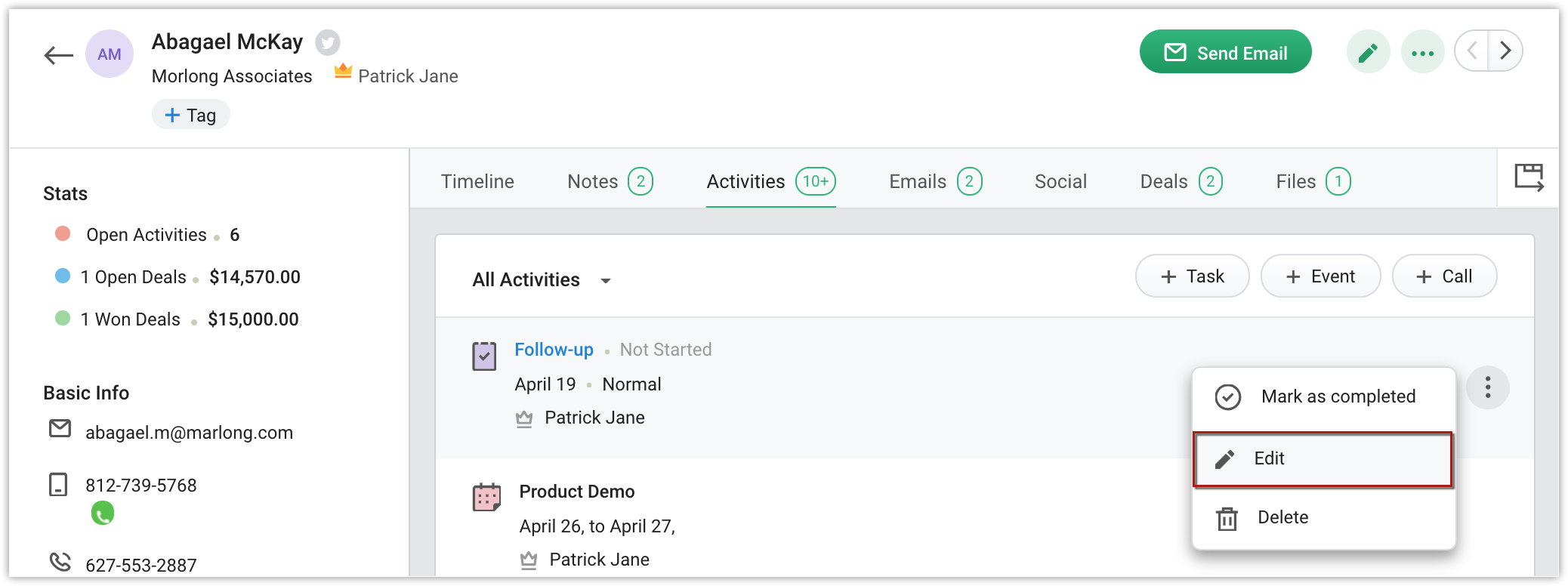 - In the Activities module hover over the Task that you would like to edit and click the Edit button.