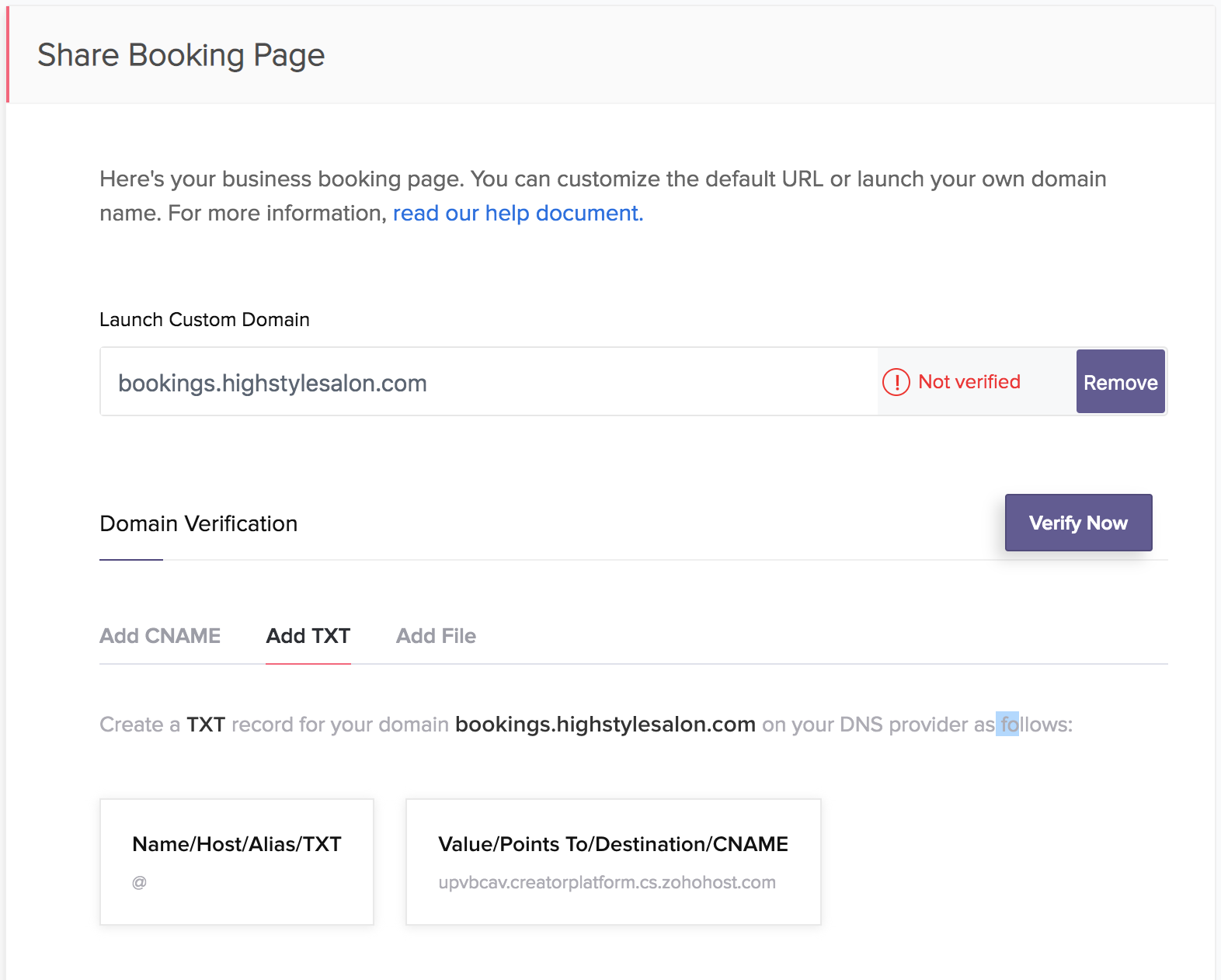 In all three methods (CNAME, TXT, HTML file), Zoho Bookings will generate the details that your domain needs to recognize the subdomain. You’ll only have to add and verify.