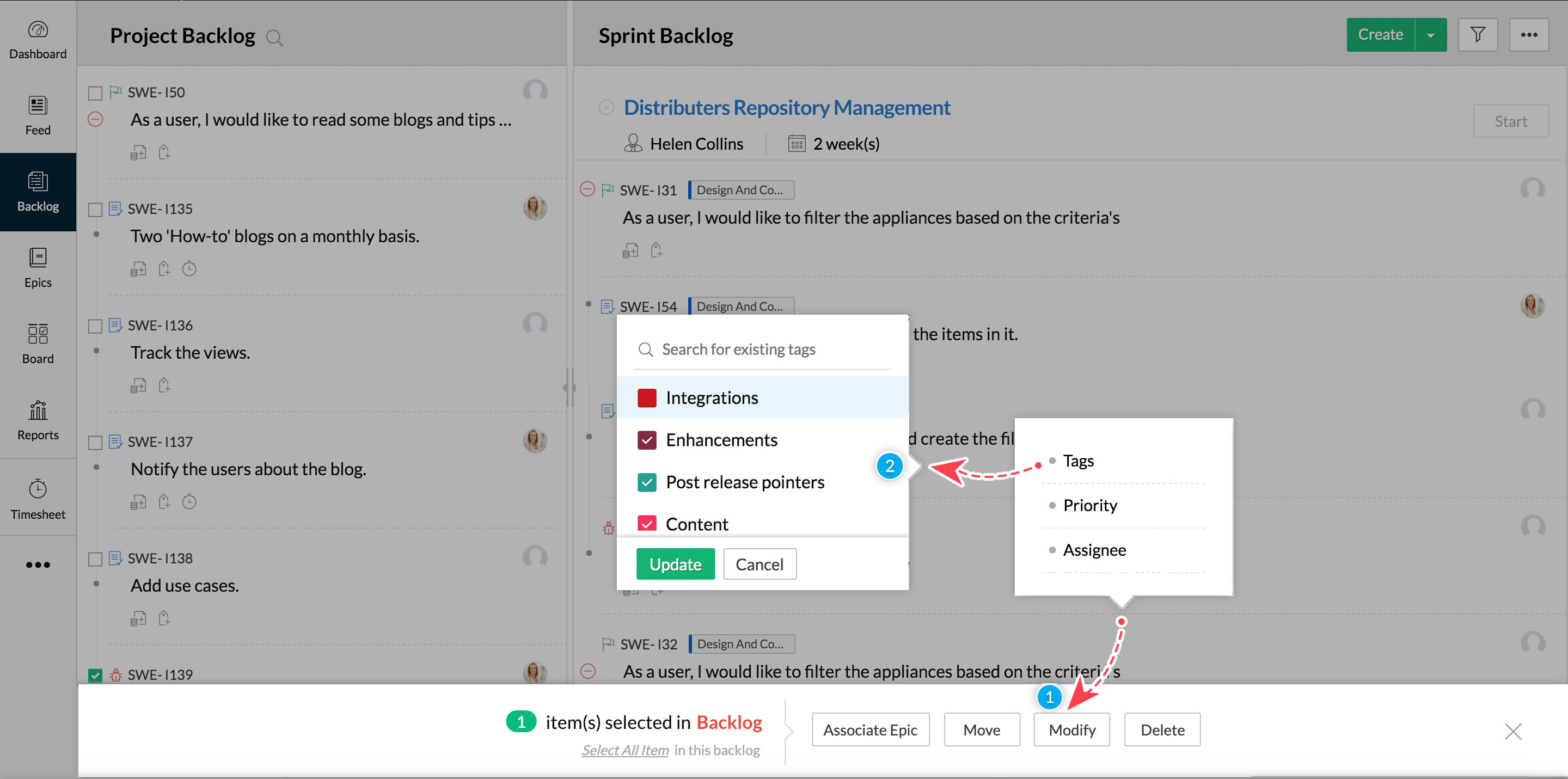 For example, if your team works on three different processes simultaneously and has work items scattered randomly, how can you classify them? Let's say the three different processes are integrations, product road map, and new enhancements. All three can have individual tags, and you can associate the work items to the relevant tags.