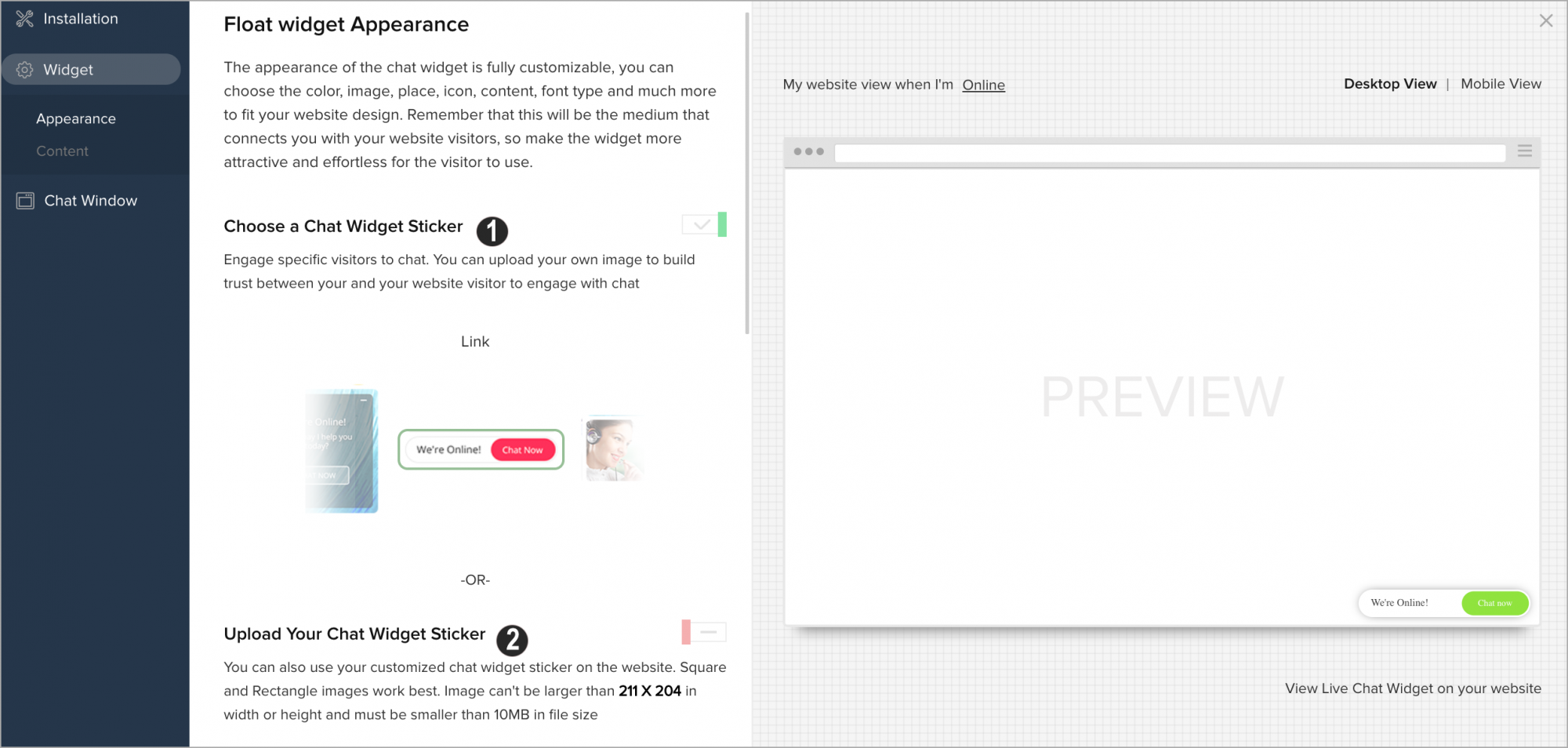 2. Instead, personalize your live chat widget sticker : Here, we let you upload your very own widget sticker to give your button widget sticker a more personalized touch. The recommended size for your button live chat widget would be 220 x 7.