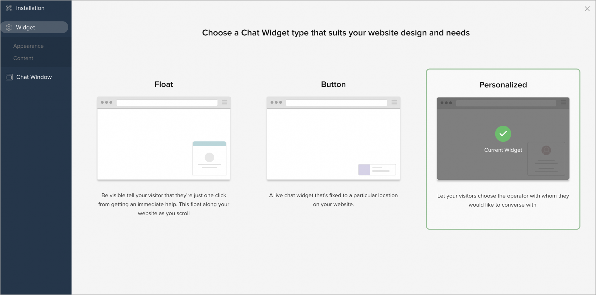 If you wish to track the website visitors, you should choose the Float chat widget option. The button or the personalized widgets will track the visitors on your site. If SalesIQ stopped tracking the visitors on your website, then go to Setting > Websites > website name > Live Chat Widget > Widget, and check if the Float widget option is chosen.