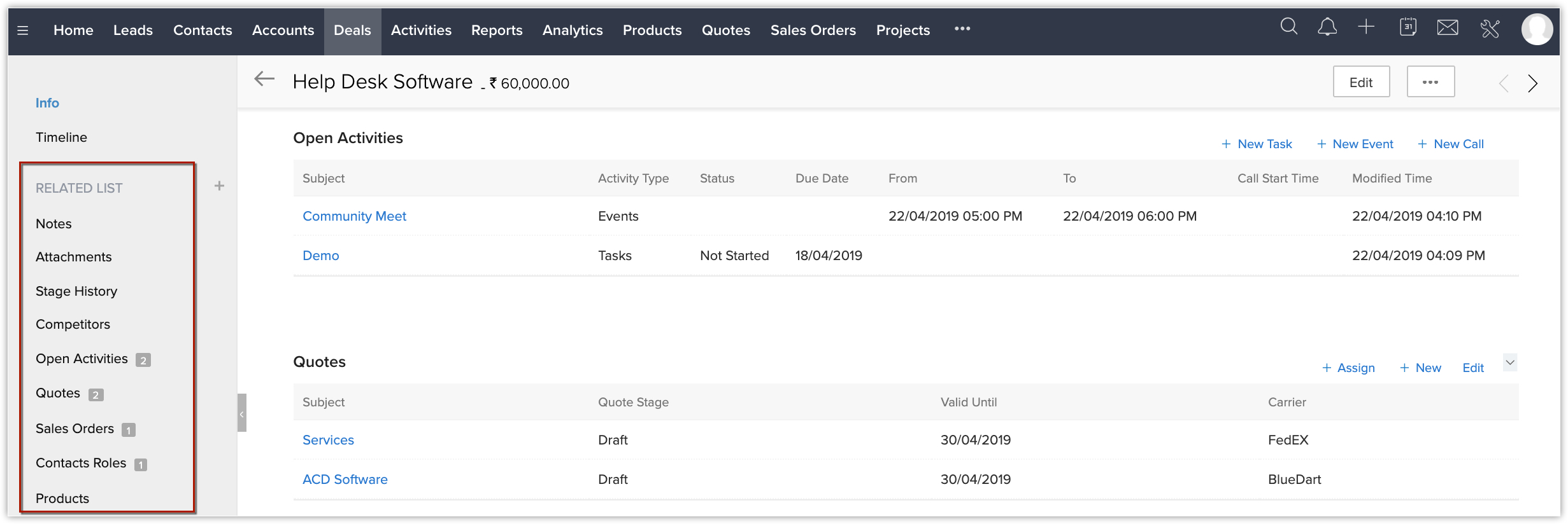 - To add a related list in the Details page of a record, click More button > Add Related List. Click Unselected Related List and choose the required list.