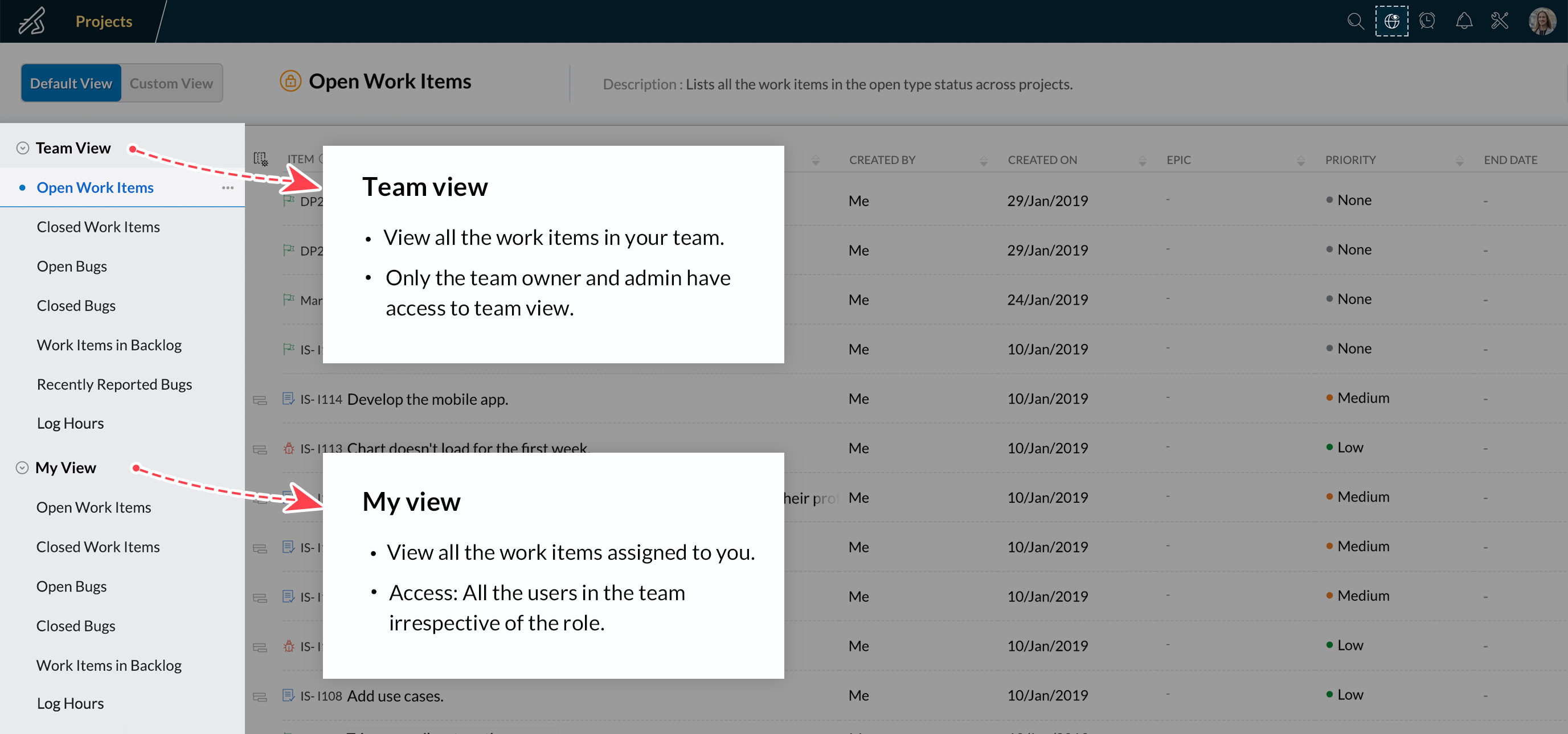 Default view lists all the work items in the team across projects, epics, and sprints. To navigate to Default View, click