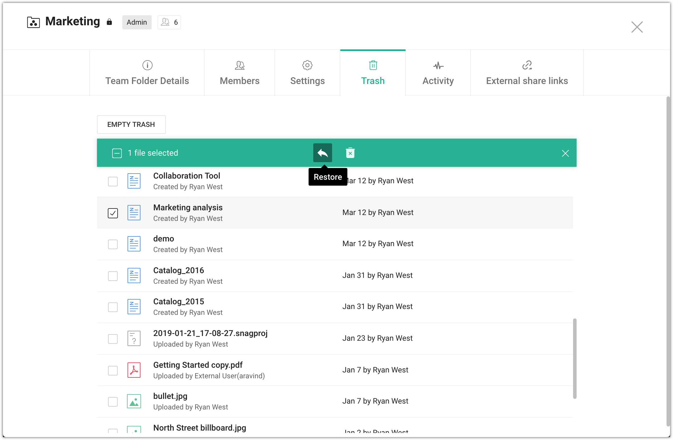 - Both Admins and Organizers can restore deleted files and folders from a Team Folder's Trash.