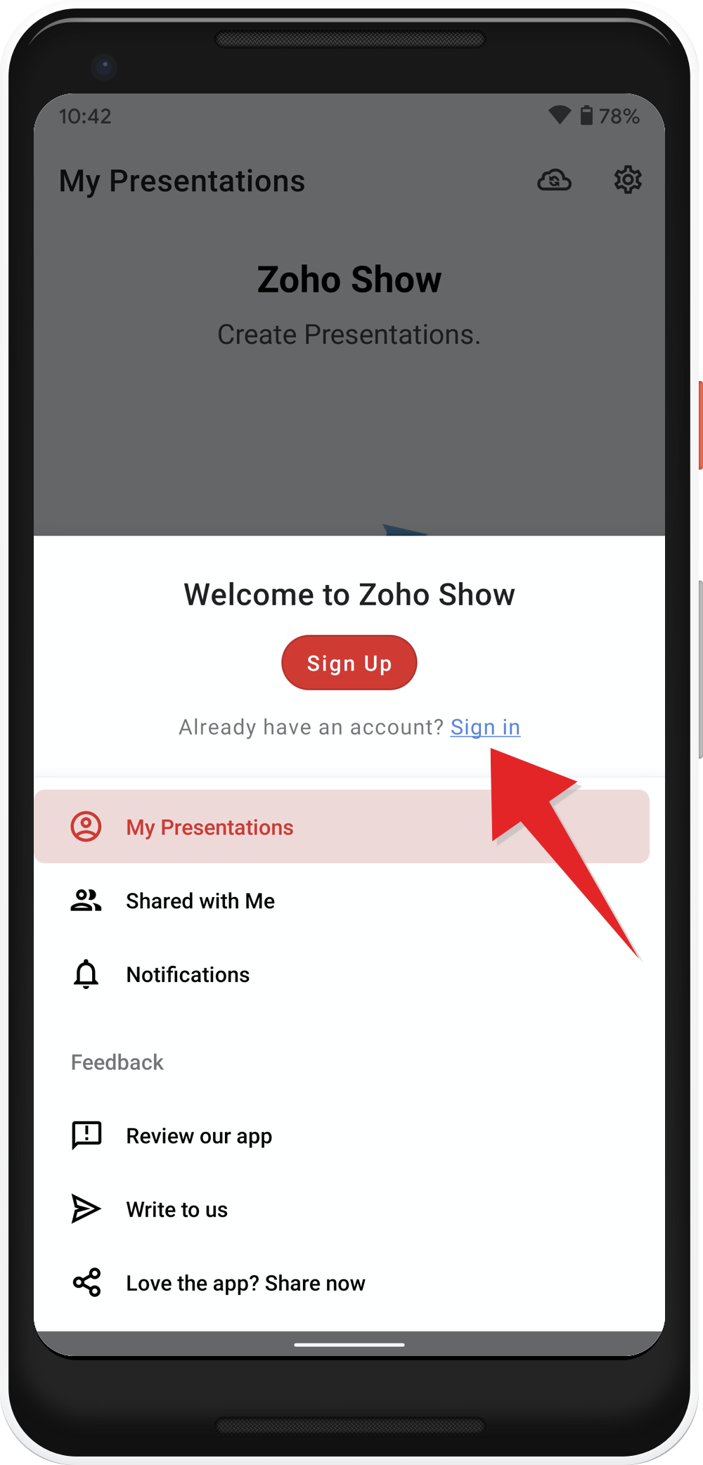Download the Zoho Show app from the Play Store on your android phone or tablet to quickly create a new presentation or to add a presentation from any of the file storage app. You can set up Zoho Show account using either your email address or your social media account, to enjoy all of Show's free services. You can view or present slides effortlessly without having to sign into the Zoho account.