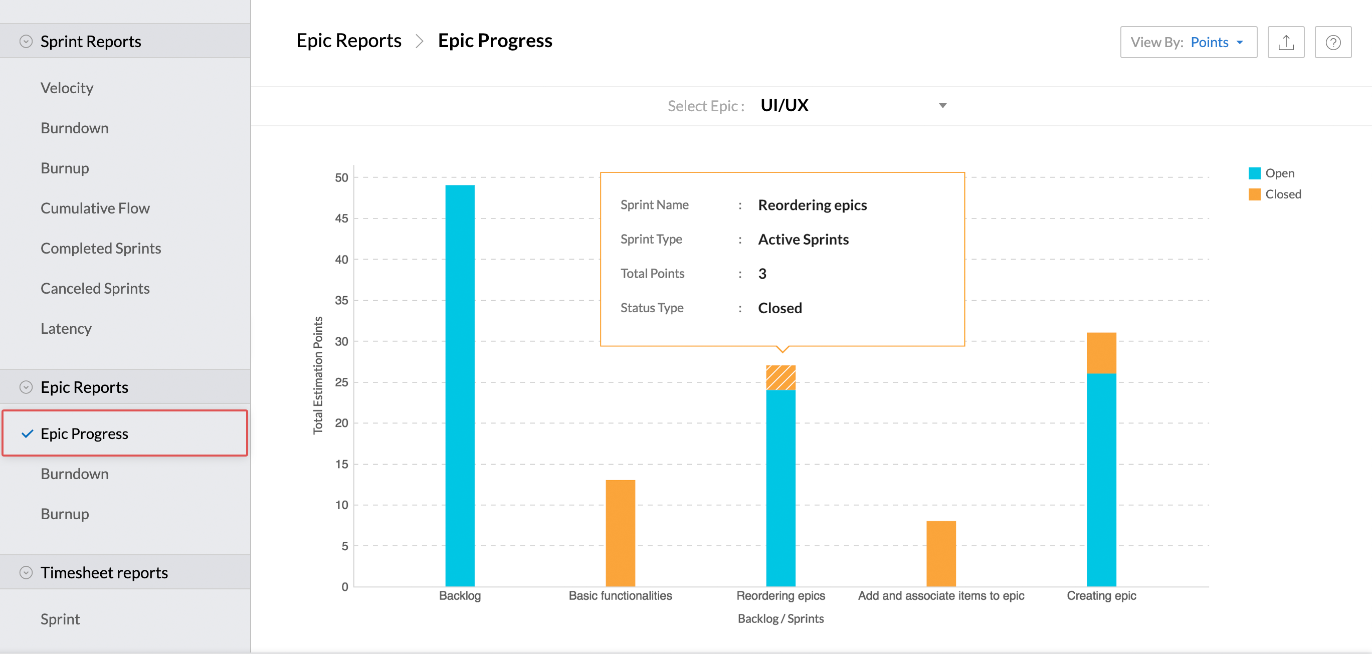 - Epic progress report by points - Track the open and closed points associated with the epic.