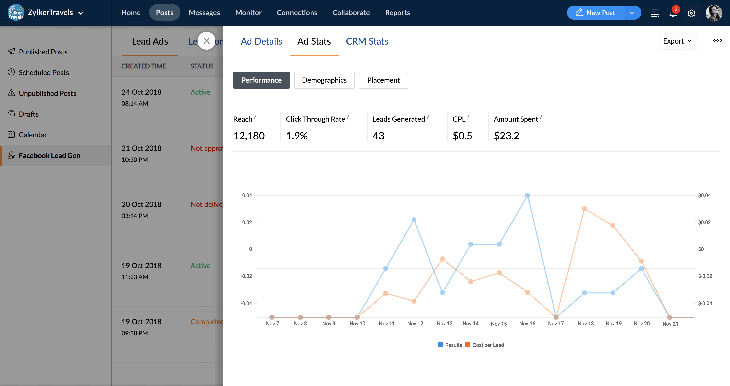 There are three kinds of statistics available in the detailed view of a Lead Ad: Performance, Demographics, and Placement.