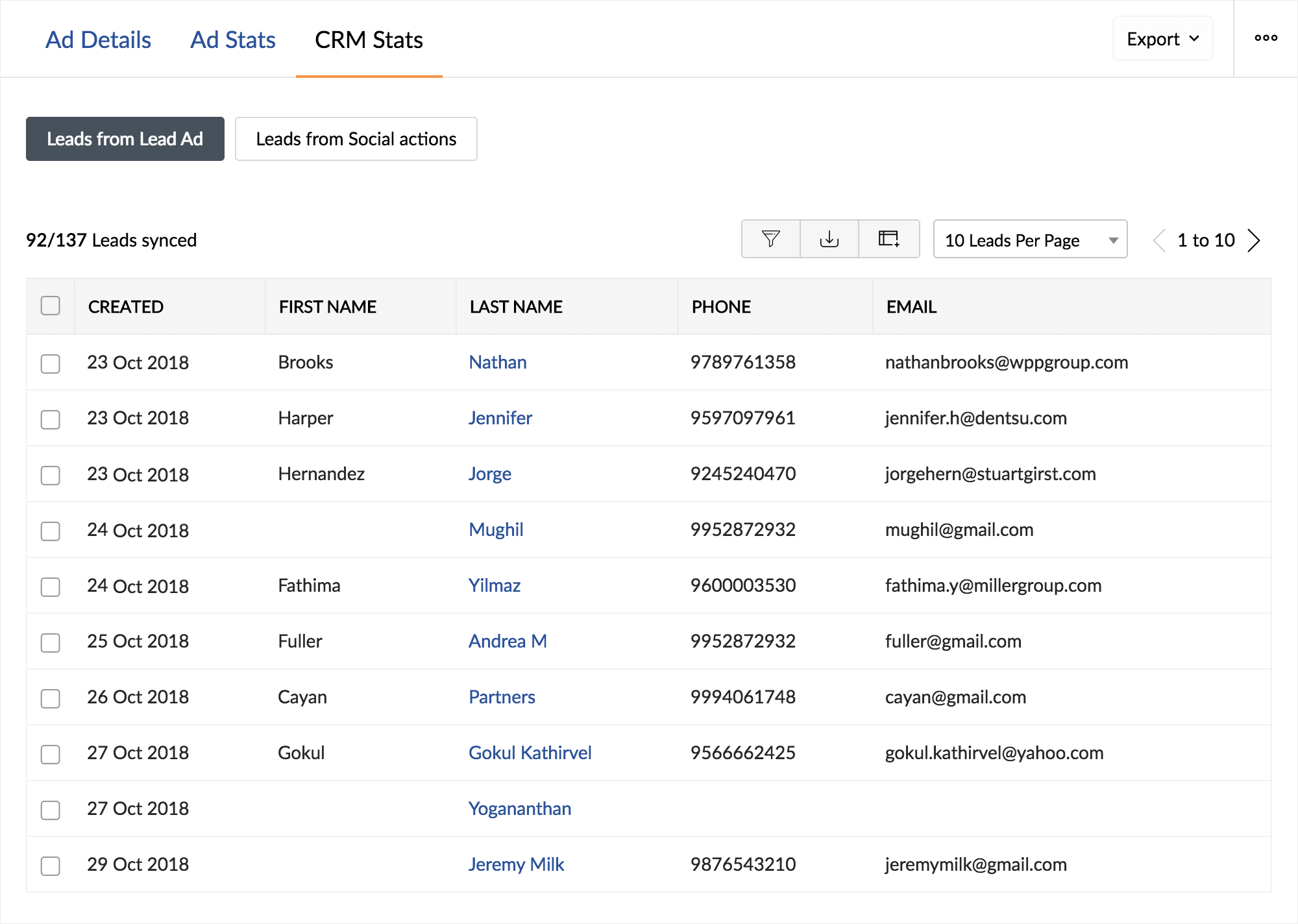 Leads from Social Actions tab to view all the new leads and contacts generated when your audience engages with the Lead Ad on Facebook by liking or commenting on it. Learn more about