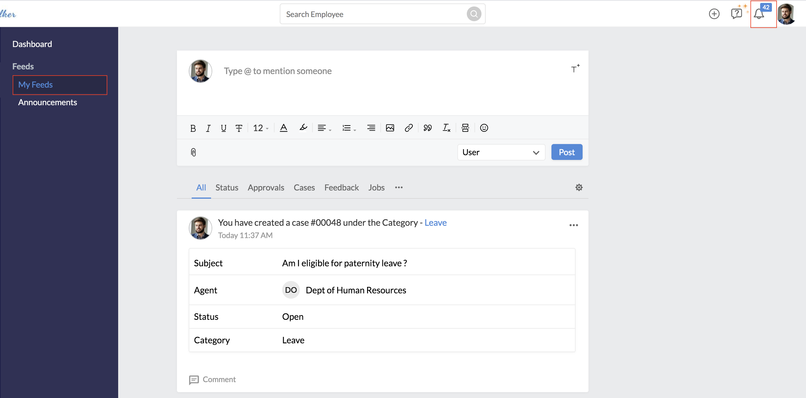 Feeds enable your employees to post messages for specific members, to departments, and to groups. Feeds can be used to have meaningful official discussions or make announcements related to the team. Using feeds, birthday and farewell messages can be posted to specific users by tagging them with an @ mention.