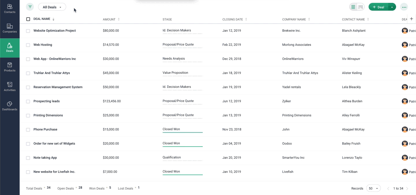When there are lot of records in the Deals module, using filters will help find the required set of records easily. There are various set of advanced filters available such as: Time based filters, based on activities carried out, deal stage, email status, etc. You can simply choose the appropriate filter, enter the criteria and apply. All the records which maces the specified criteria will be listed. You can apply upto five filters at a time.