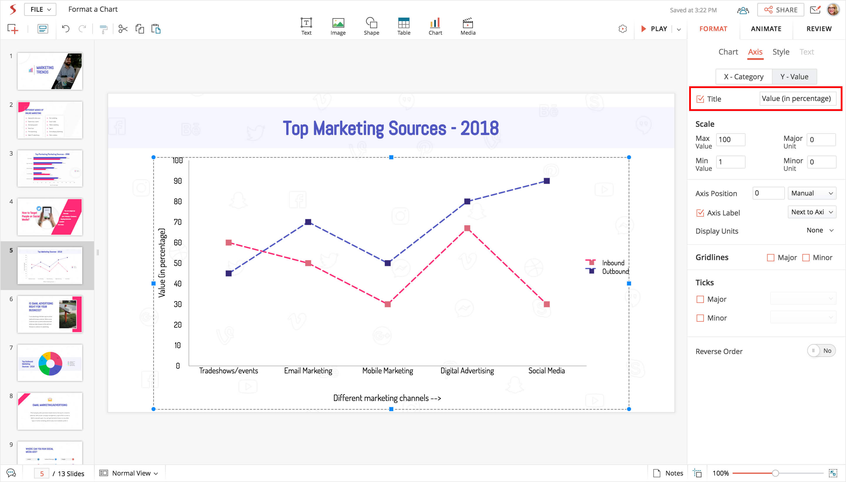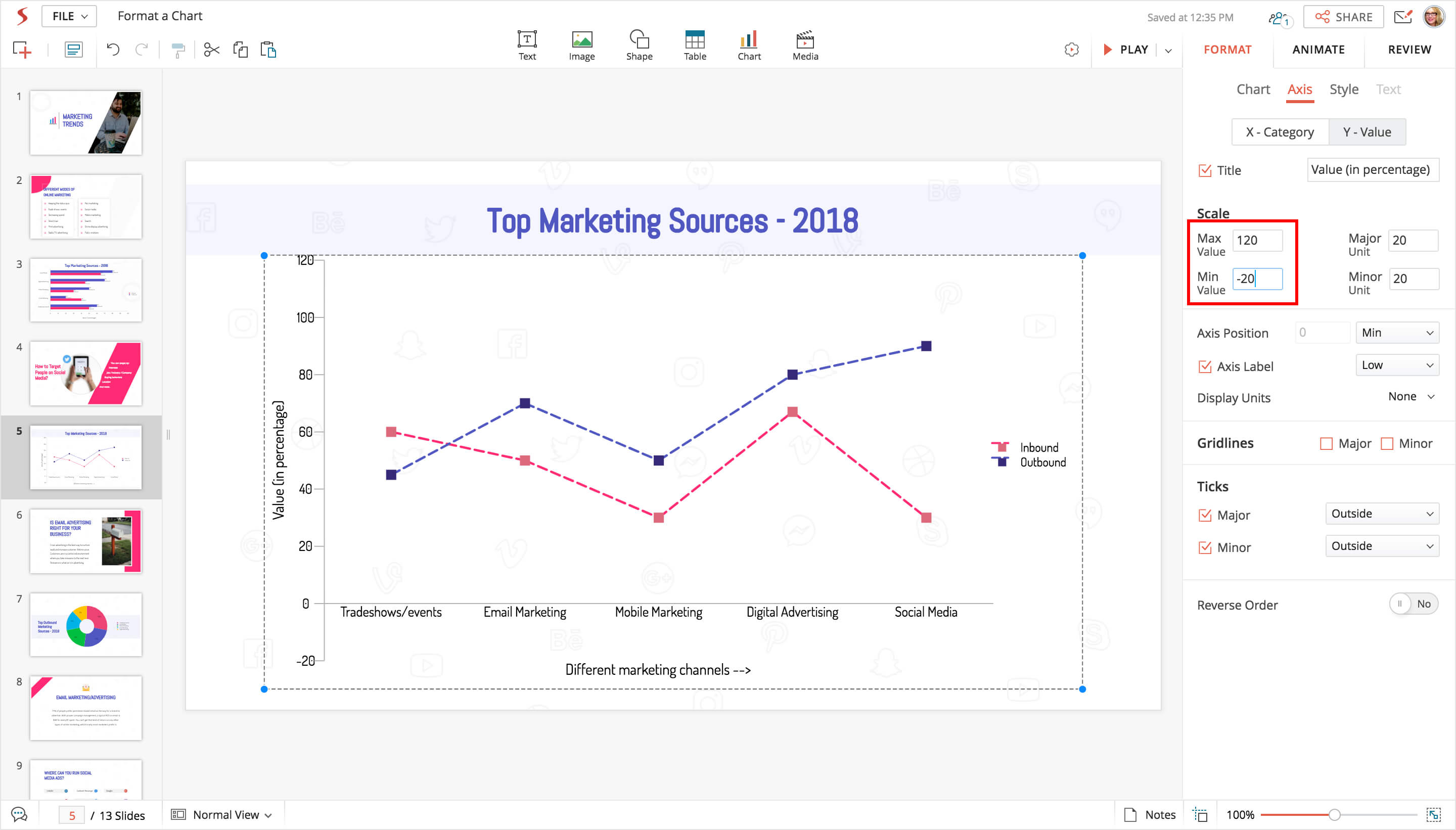 2. Choose Value axis within the pane and select the Scale field to set your desired values as follows: