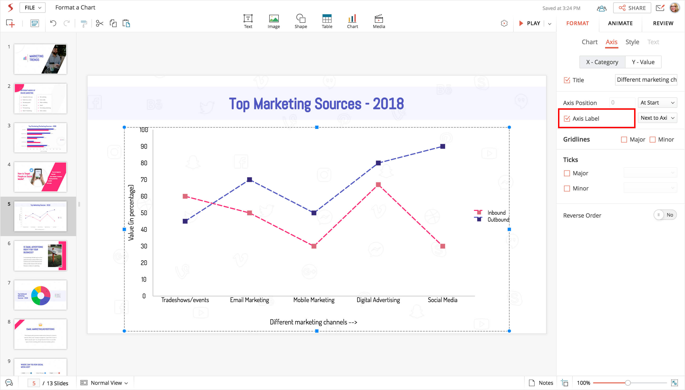 Main parts of Axis: Axis title, axis layout, axis label, axis major and minor, and, axis grid lines. You can choose to show or hide these axis elements while delivering your presentation. Note that pie and doughnut charts do not have axes and cannot display any of the axis properties.
