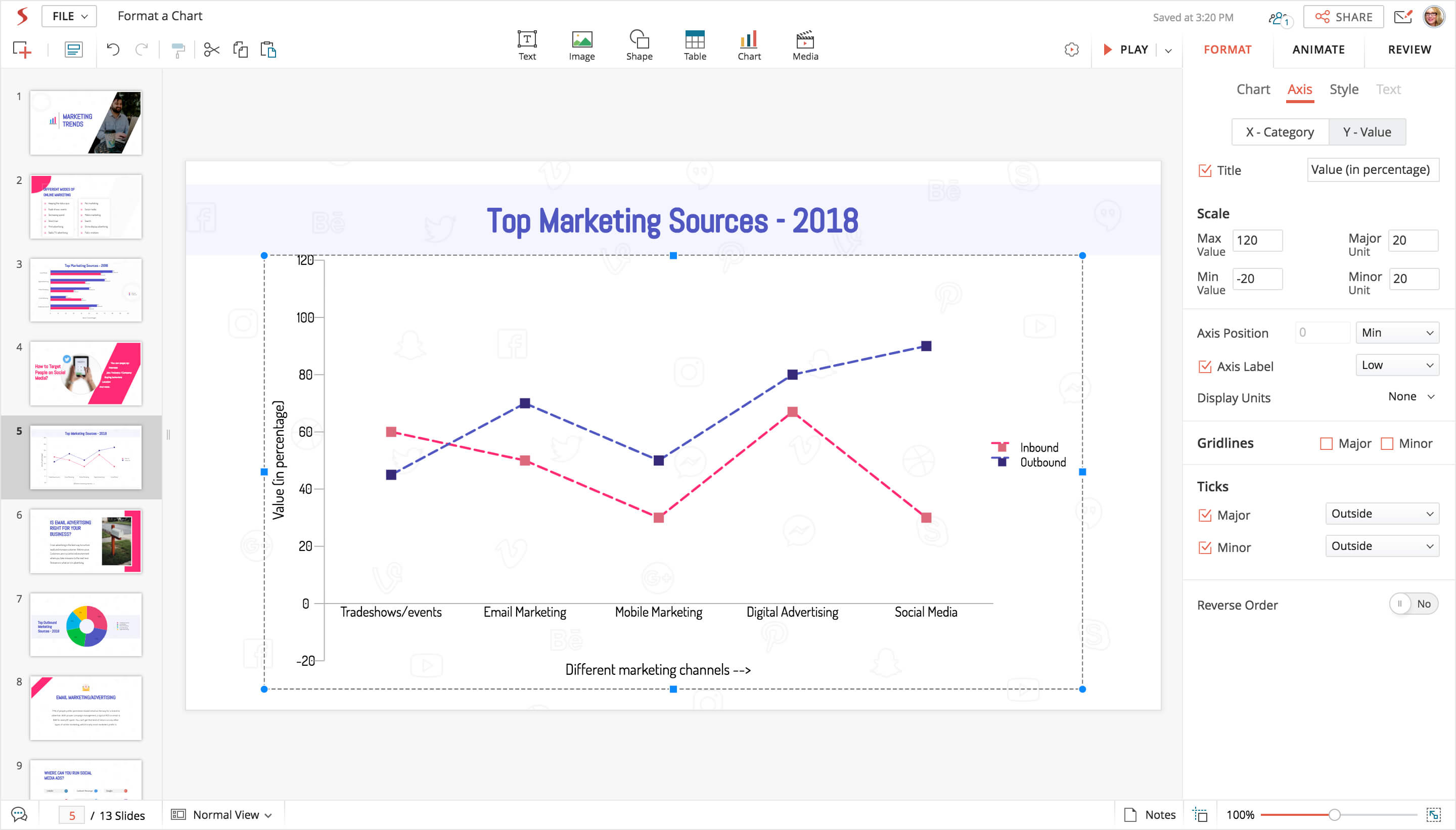 Each chart you add to your slides is unique and presents data in a different way. You can choose to customize your charts using a variety of chart formatting options (styles, designs, and layouts, or change color, borders, axis ticks, labels) to make them more visually attractive and to highlight impressive data.