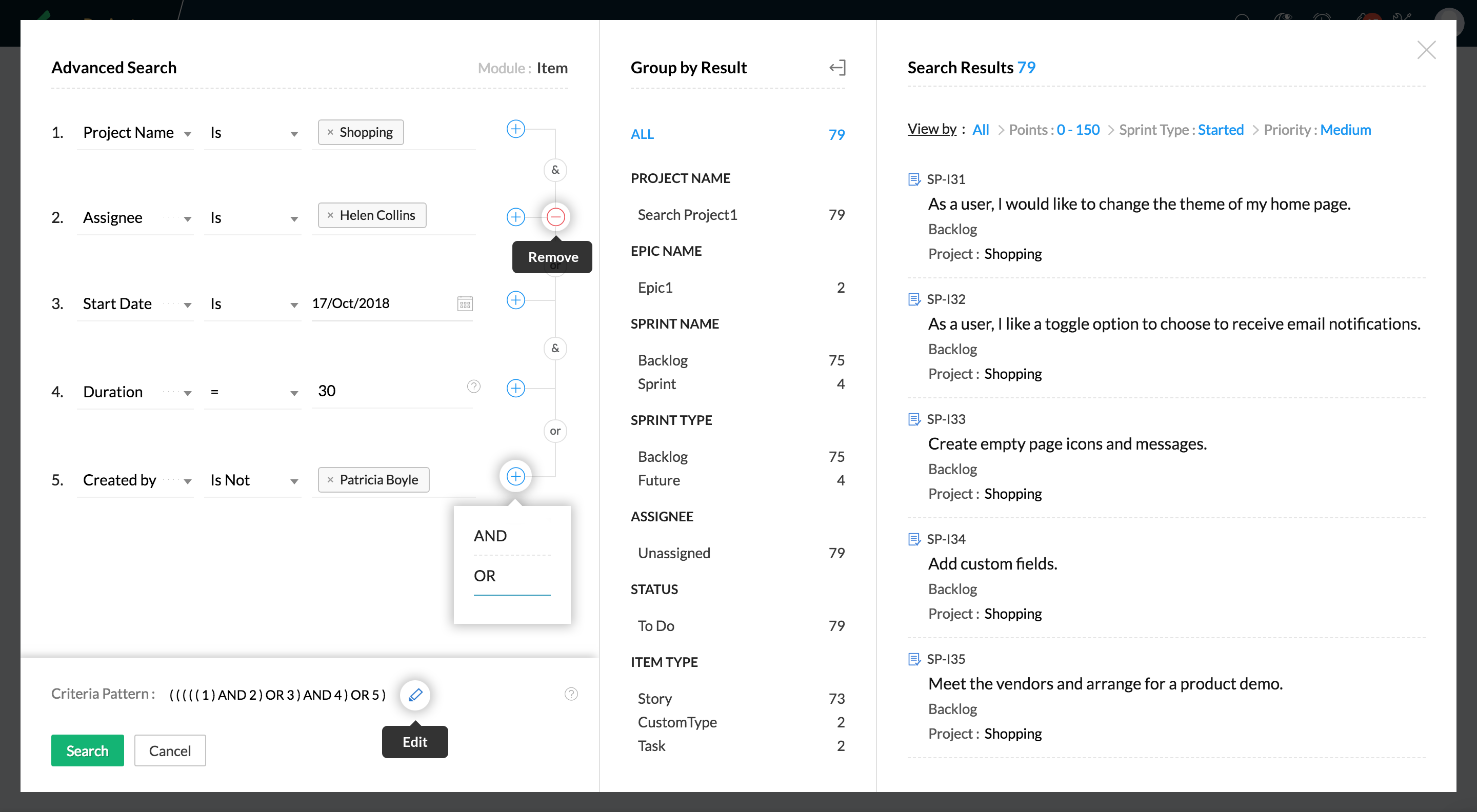 You can choose different fields, set the operators, and choose multiple conditions in your advanced search to search for work items.