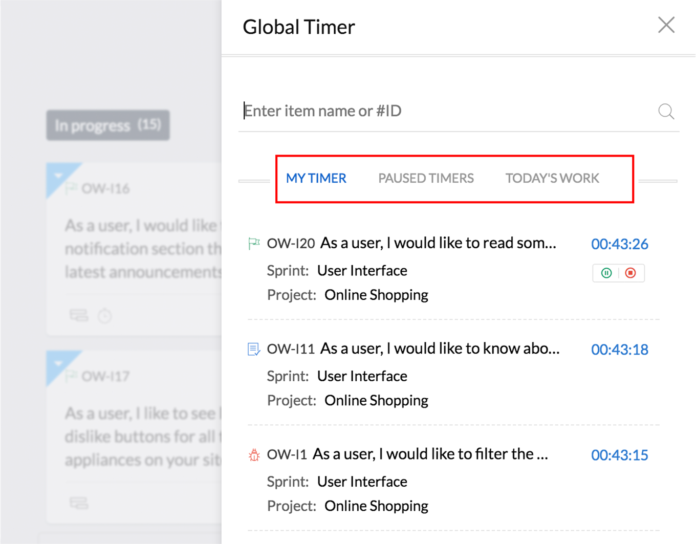 Start a timer for your work items right within the Global Timer.