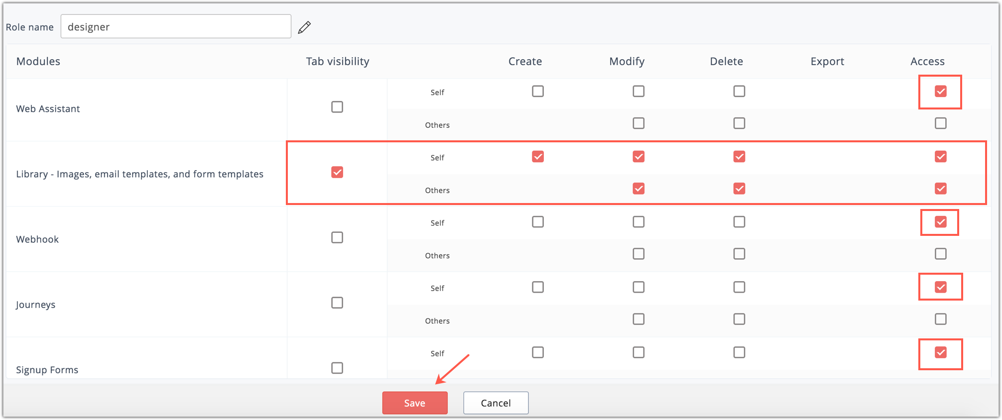 Delete | Delete current user's image, folder, email template or signup form template. | Delete other user's images, folder and email/signup form templates. |