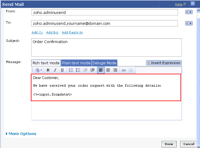 7. To send mail with formdata, specify the message as shown in the below format selecting the Rich text tab.