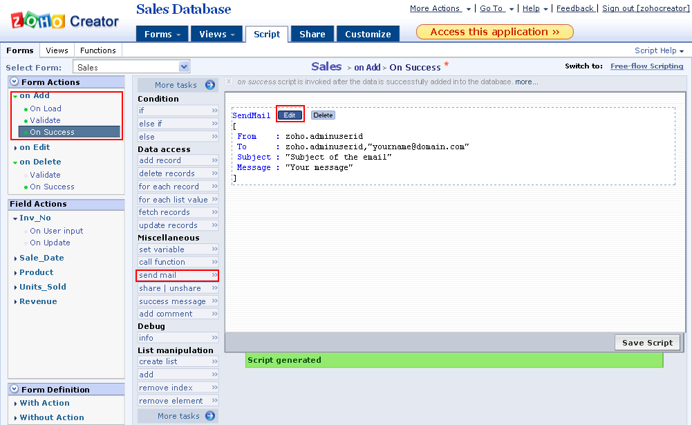 3. Select the Form action to invoke the script. For example, if you want to send mail when a record is submitted, select the form action on Add -> On Success.