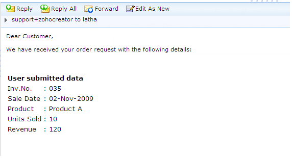 9. Click Save Script to save the script. Now, when a record is submitted, the configured email is sent to the specified To address with the Form data. A sample format of the email is shown below: