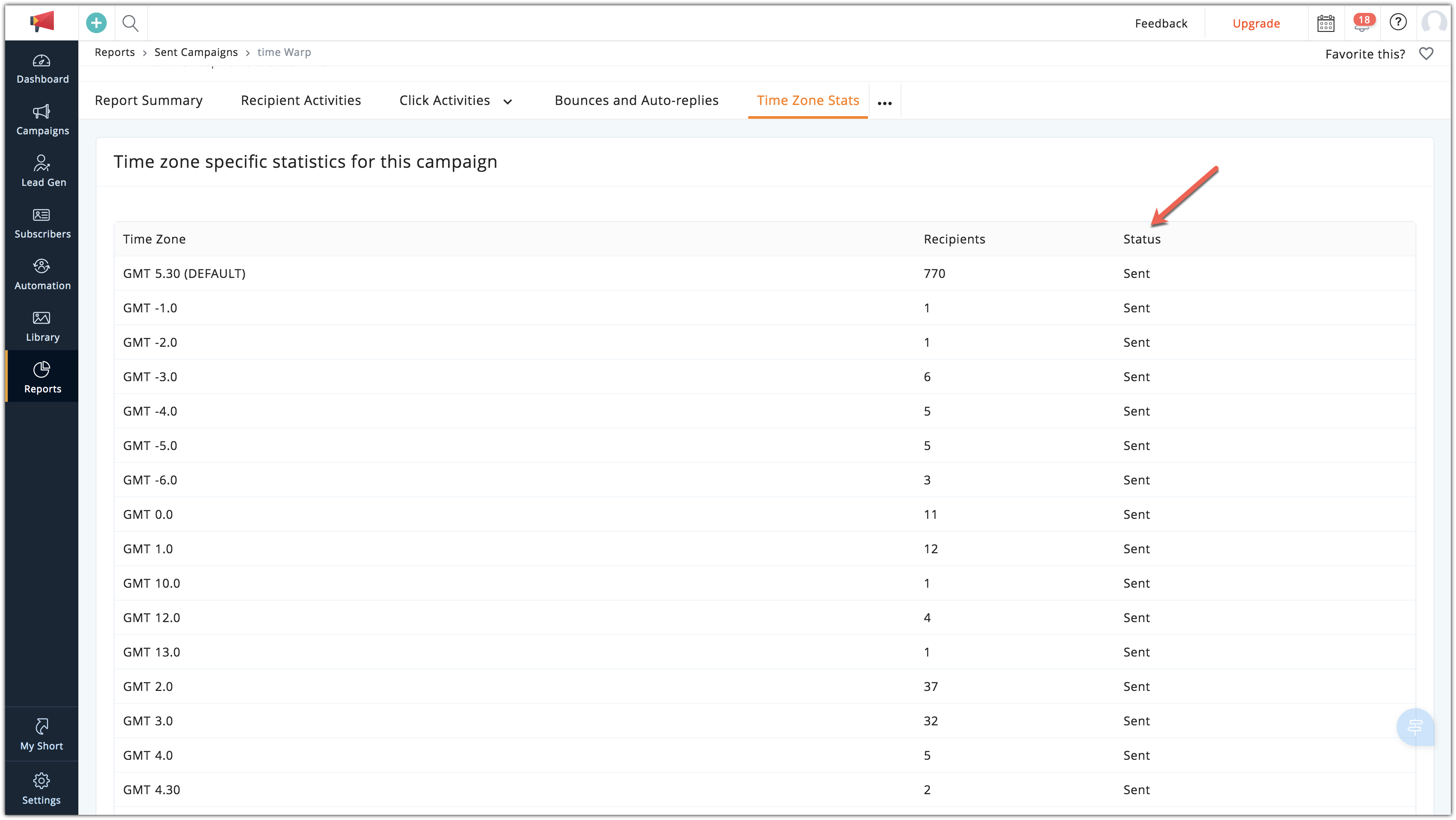 3. The time zone stats consists of real-time campaign status of different time zones recipients. This stats helps you find the number of recipients (across different time zones) who are yet to receive the campaigns you send.