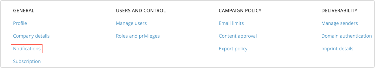 Notifications consists of two parts: Campaign settings and Mailing lists. You can receive timely notifications about your campaigns and mailing lists by configuring the respective notification settings.