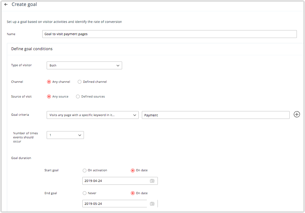 Goal duration – You can set the time period during which the goal should be active. Start the goal either on its activation or on a particular date. End the goal on a particular date or choose to never end it.