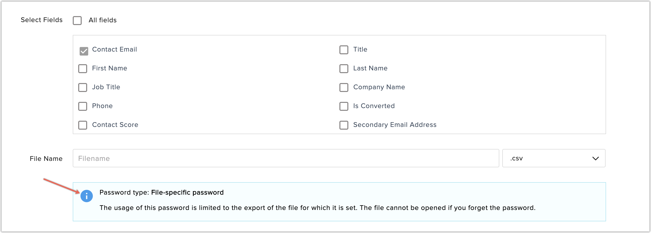 When file specific password is chosen as the type of password protection, users should set a new password for every file that is exported. The usage of this password is limited to the export of the file for which it is set. The file cannot be opened if users forget the password. Password can be set in the Export Contacts page as shown in the image below. Opening these files will require users to enter the password that was set.