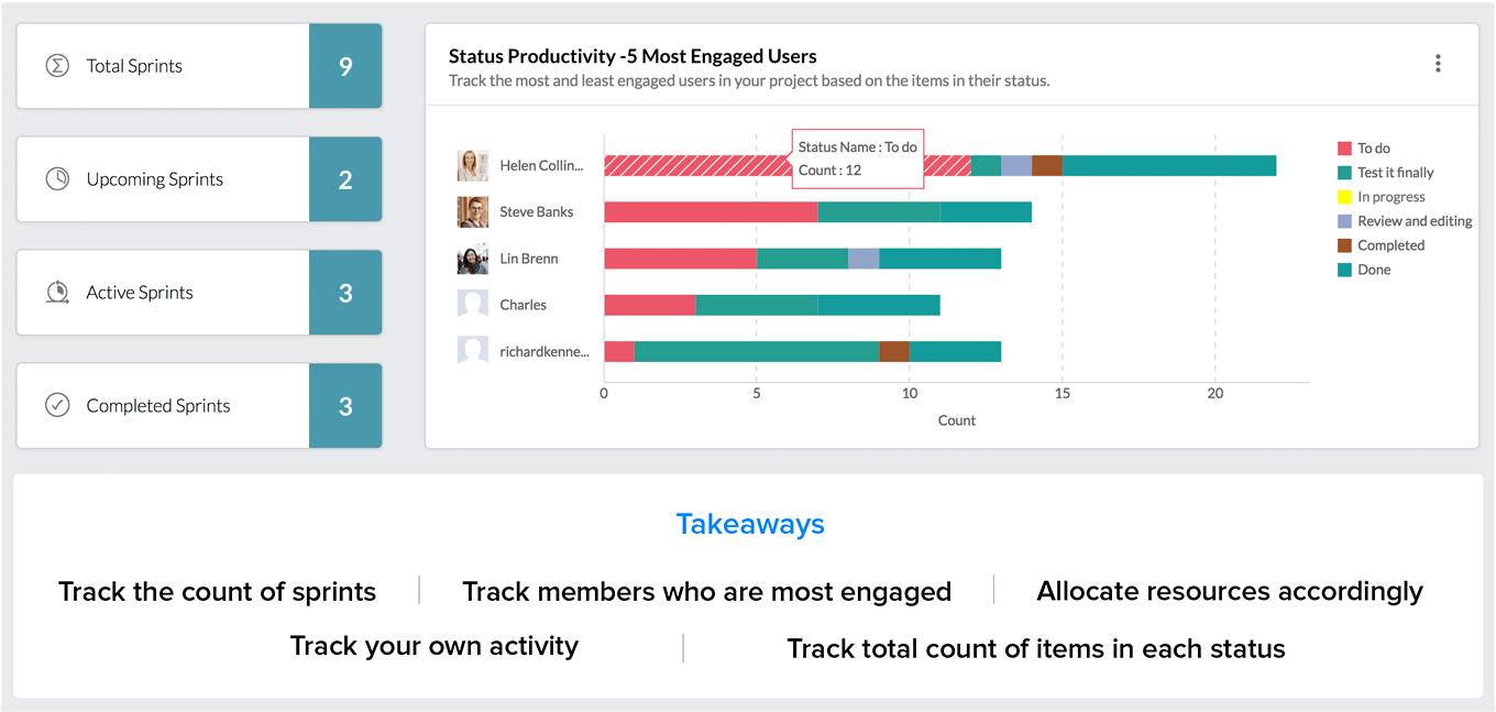If you want to check the most and least engaged users in your project then status productivity chart is the right place to stop over. In the chart below, Helen owns 12 work items in the status 'To Do' .