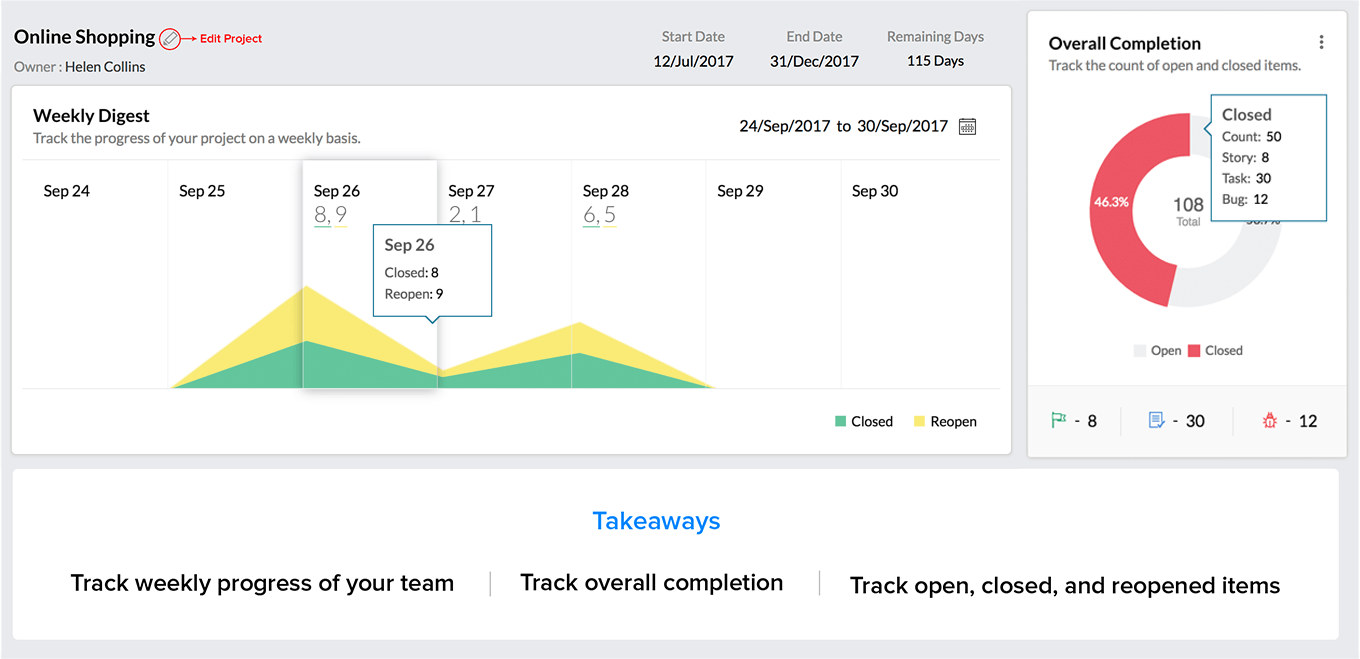 - Percentage in the red and grey areas represent the overall completion percentage of the project. In this project, the team has more work items in the open status than closed status