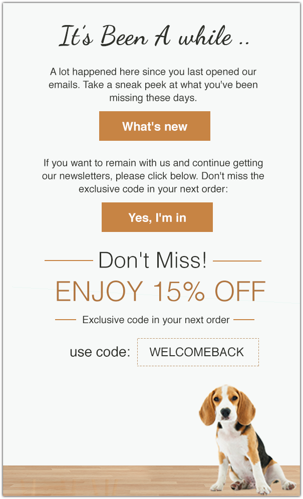 You may usually send offers, coupons, and other marketing strategies to engage your leads. The leads you're sending winback emails are the ones who didn't react to those previous emails. This means those offers or strategies have not worked well with them. Think of different strategies and pick the one your leads would be more interested in. You can even send exclusive offers to idle leads.