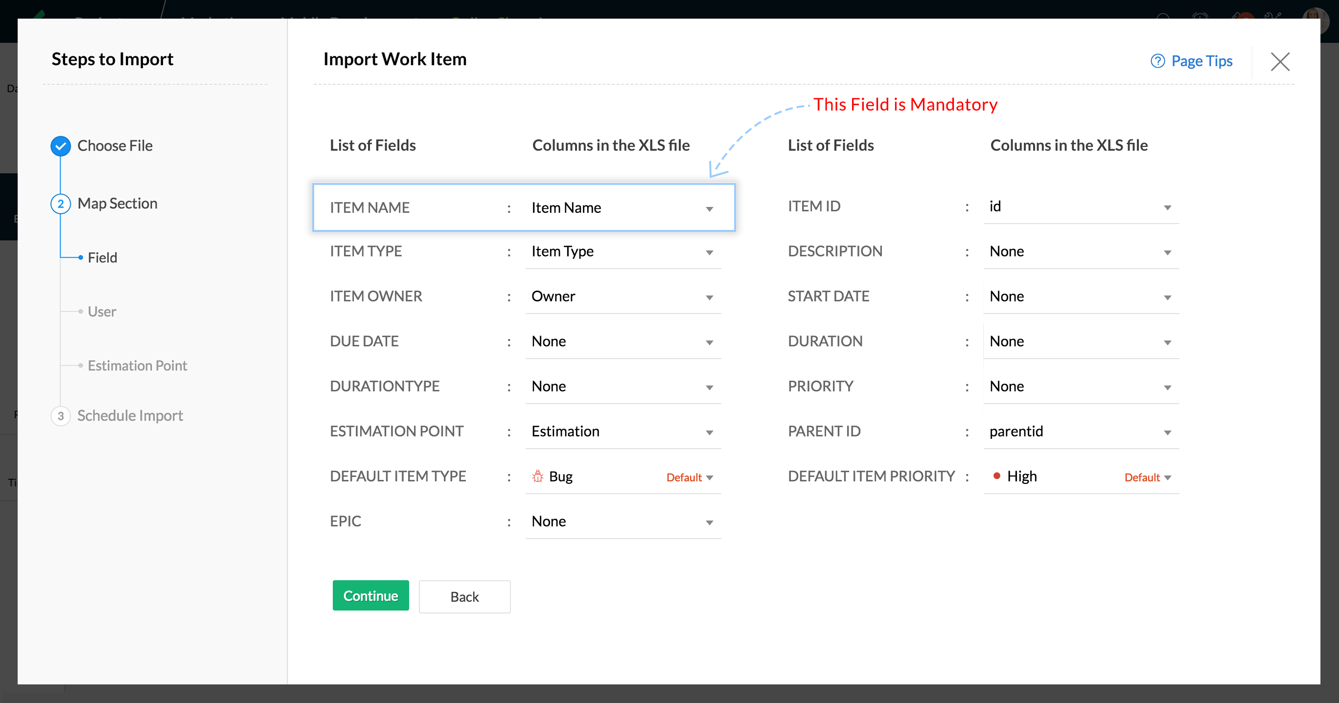 Map the fields accordingly and click Continue . The Item name column is mandatory.