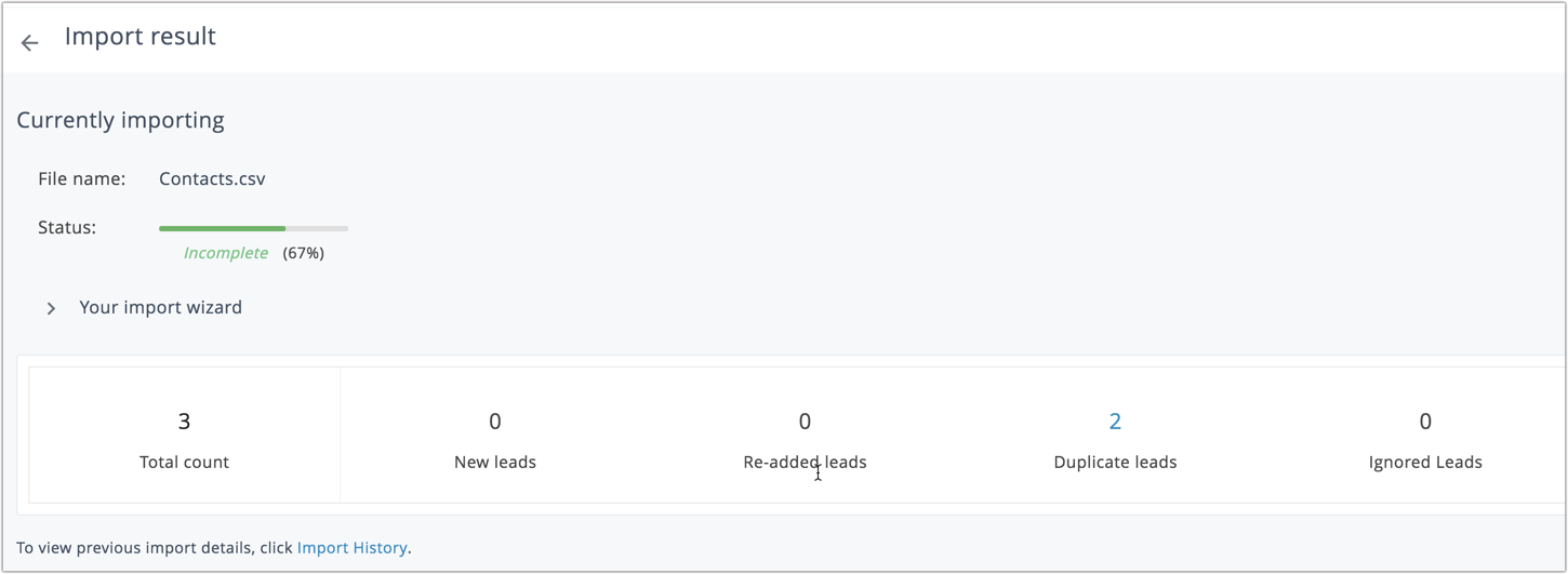 You can view file name, import status and, the number of newly added, re-added, duplicate and ignored leads. You can click on the Import history link to view previous import details.