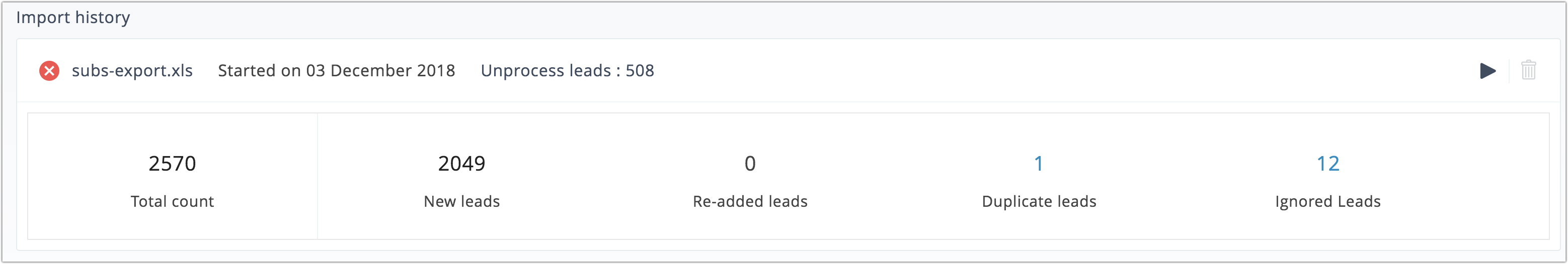 You can view file name, import status and, the number of newly added, re-added, duplicate and ignored leads.