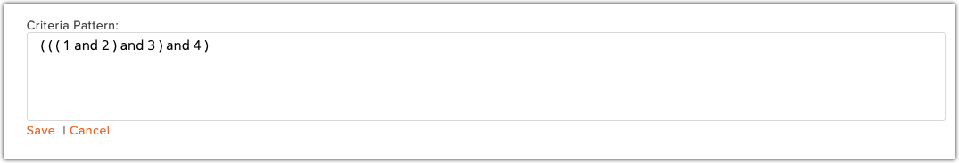 The default criteria pattern is ''( ( ( ( ( 1 and 2 ) and 3 ) and 4 ) and 5 ) and 6 )'' if you choose all six criteria. However, you can choose between the operators 'And' or 'Or' between the conditions. If you wish to change the position of the parentheses, click the link Change pattern to edit the pattern.