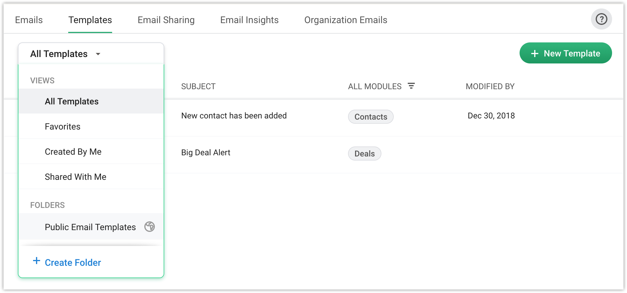 While creating email templates, you might want to group certain templates together in a folder. Bigin allows you to create a folder for the email templates you create. You can also specify with whom you would like to share the folder.