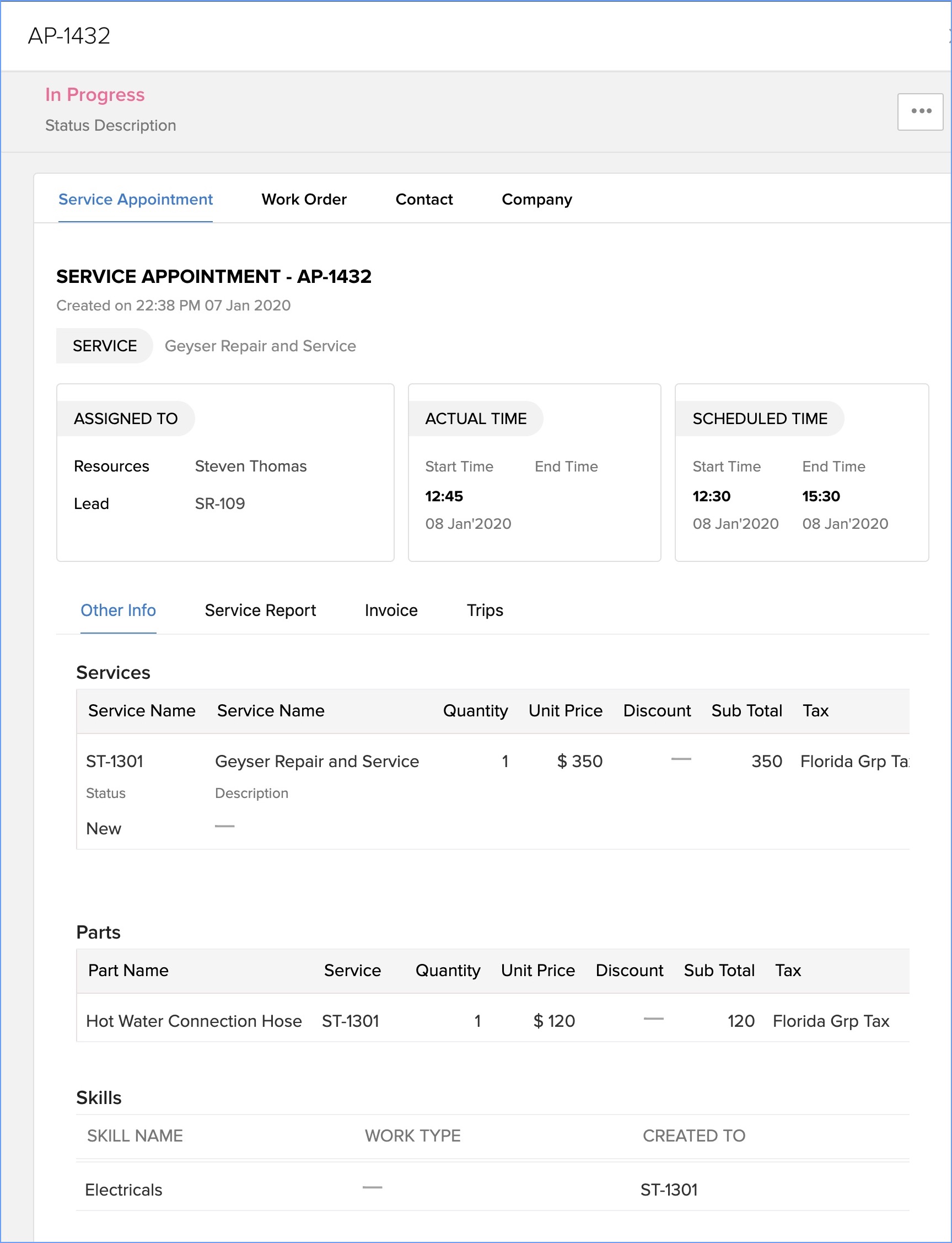 Once the field technician starts work on the service appointment, then the status of the service appointment changes to In Progress.